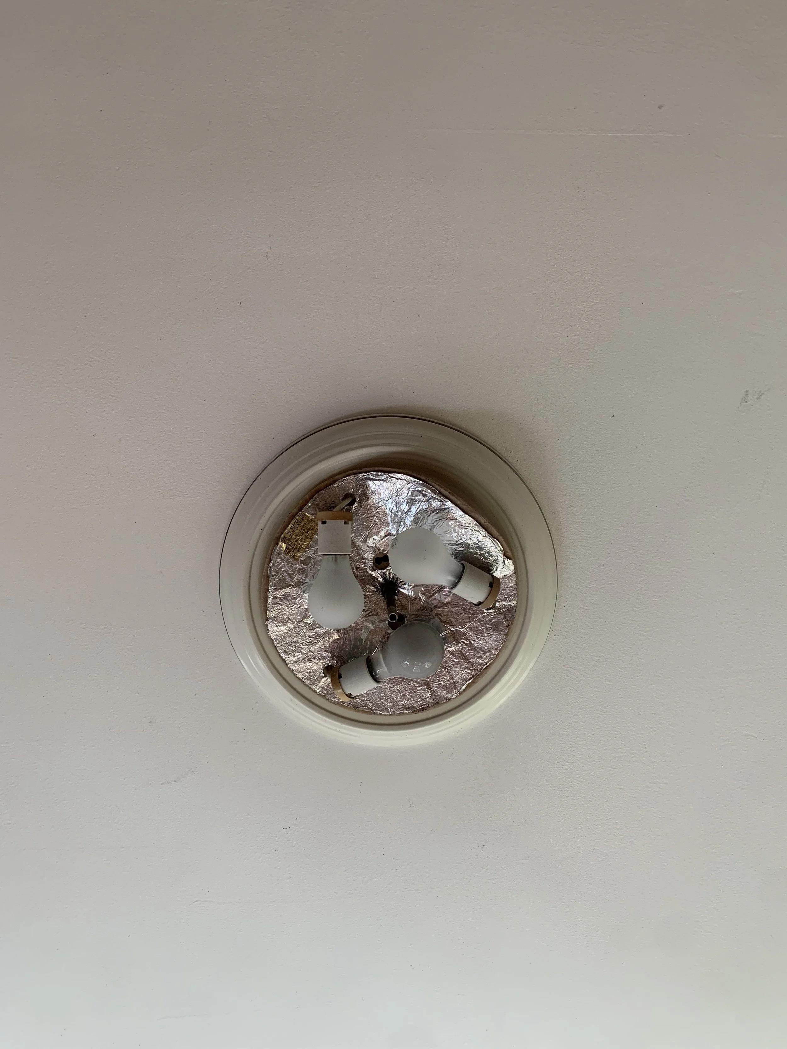 For two years, every time my eyes alighted on the ceiling of my living or dining room, I thought to myself, “this will not do”. The classic renter’s problem of ugly boob fixtures, made worse by heavy glass domes that wouldn’t stay put, and had to be removed for safety. It was a terrible visual distraction every time I lay down on my back to stretch.