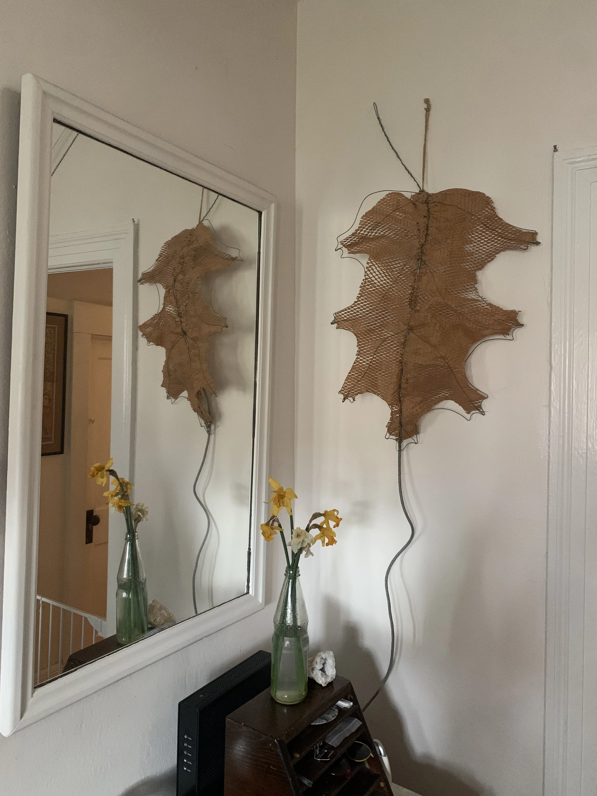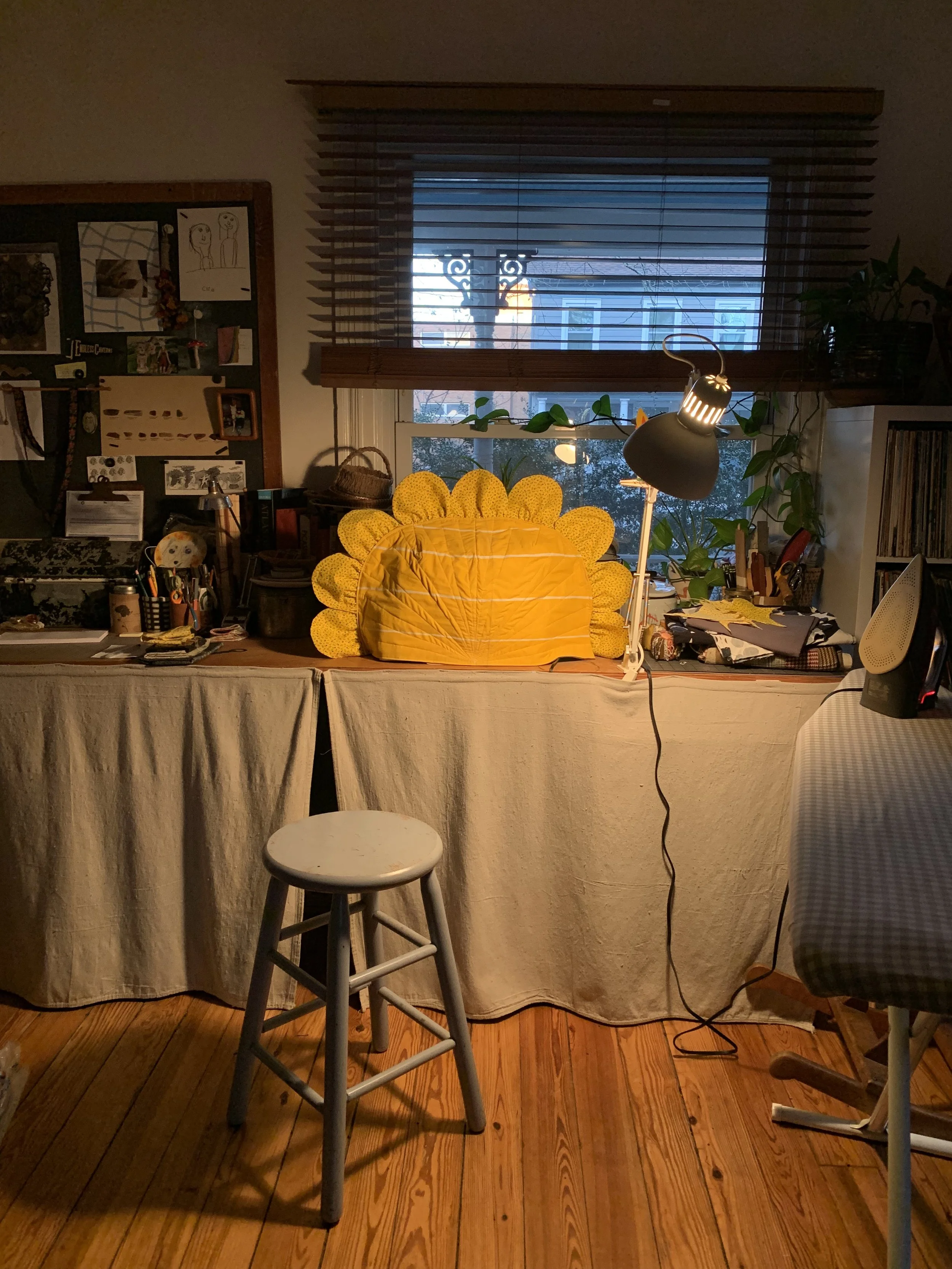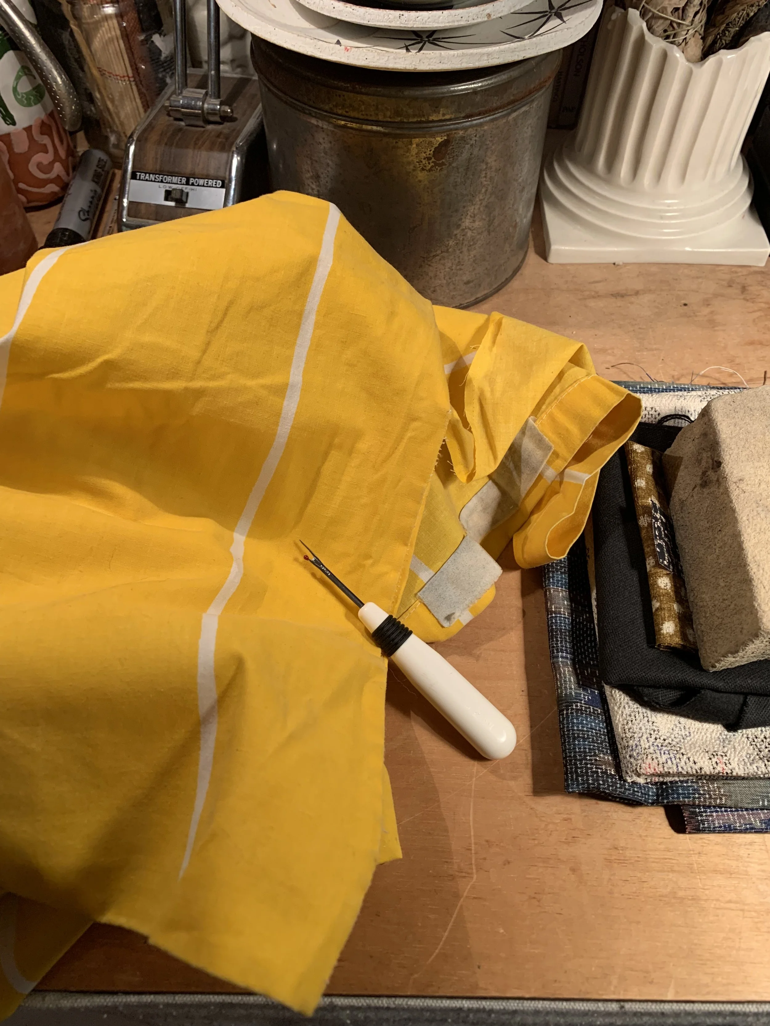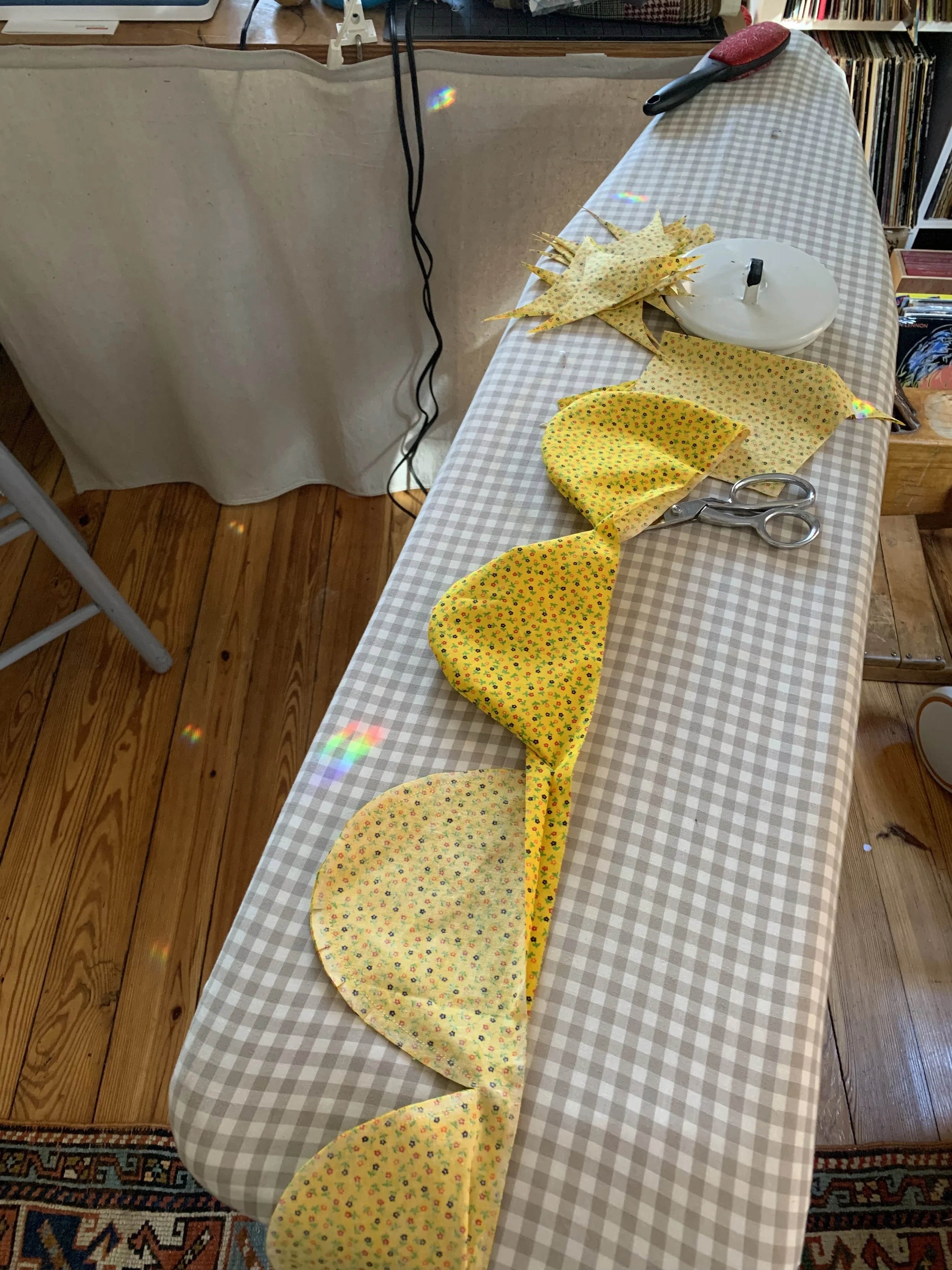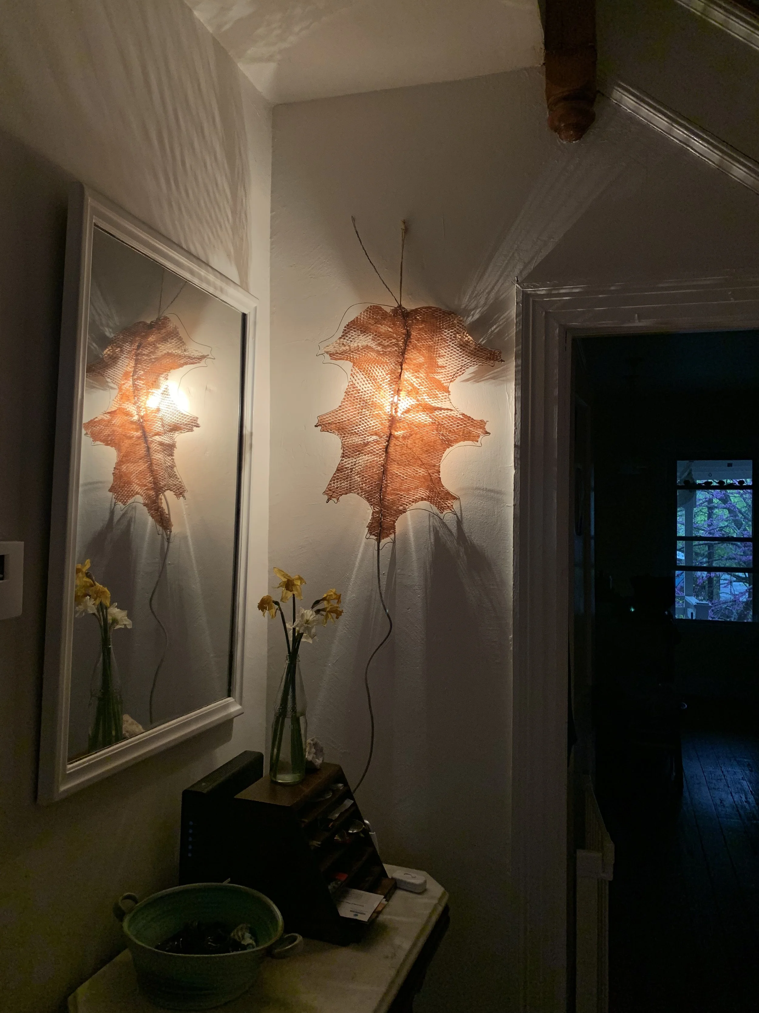 How to fix it? I pondered for 2 years, until one day it came to me. MAGNETS. The outer round rim is metal! Magnets sewn into fabric shades, plus new, warm toned LED bulbs that won’t get hot.